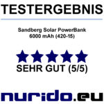 Unser Test-Fazit: Die Sandberg Solar PowerBank hält exakt, was sie verspricht. Verschiedene Mobilgeräte können zuverlässig unterwegs aufgeladen werden, wofür genügend Kapazität vorhanden ist. Ein normales Smartphone lässt sich mit den 6000 mAh in der Regel drei Mal vollständig „auftanken“. Auch für Tablets reicht die Stromstärke von 2.1 A und das Solarpanel sorgt zusätzlich für einen automatischen Nachschub mit Energie. Dass es eine Garantie von fünf Jahren gibt, ist ein weiterer Pluspunkt.